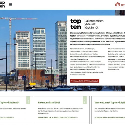 MARKKU HIENONEN Topten jalkautui Pohjois-Suomeen ja Kaakonkulmalle Taustaa Topten-kortistostaMaankäyttö- ja rakennuslaki MRL sekä sitä tarkentava maankäyttö- ja rakennusasetus MRA ovat voimassa vielä vuoden loppuun. Molemmat ovat kuitenkin siinä määrin yleispiirteisiä ”raameja”, että tarkemmat ohjeet ovat osoittautuneet tarpeellisiksi. Ympäristöministeriön ja eri järjestöjen julkaisemat täydentävät ohjeet ovat olleet ei-velvoittavia, mutta hyvin tärkeitä malleja ja esimerkkejä kelvollisista toimintatavoista.Uusi pian voimaan astuva rakentamislaki ja sitä tarkentavat asetukset tarvinnevat vastaavaa täydentävää ohjeistusta, kun niitä aletaan soveltaa käytäntöön.Suomen suurimpien kuntien rakennusvalvonnat ovat tehneet määrätietoista yleisimpien haasteiden ratkaisemiseen keskittynyttä kehitystyötä pääosin omakustanteisesti. Työtä on tehty yhdessä rakennusalan muiden toimijoiden kanssa, ja tuloksena on ollut merkittävän laajuinen Topten-kortisto,…