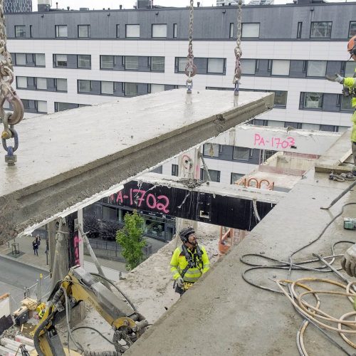 SATU HUUHKA ReCreate raivaa tietä rakennusosien uudelleenkäytölle ReCreate-hankkeessa tutkitaan betonielementtien uudelleenkäyttöä käytännössä koepurkamisen ja -rakentamisen avulla.Tampereen yliopiston johtama ReCreate on ensimmäinen EU:n Horisontti -tutkimus ja -innovaatio-ohjelman rahoittama rakennusosien uudelleenkäyttöön keskittyvä kansainvälinen keihäänkärkihanke. Betonielementtien irrotus- ja uudelleenkäyttöpilotit ovat hankkeessa keskeinen työkalu uuden tutkimustiedon tuottamiseen. Tietoa saadaan paitsi teknistaloudellisesta toteutettavuudesta, mm. ympäristövaikutuksista, säädösympäristöstä ja uudelleenkäytön edellyttämistä muutoksista työn tekemisen tapoihin sekä rakennusalan koulutussisältöihin. Pilotteja toteutetaan Suomen lisäksi Ruotsissa, Alankomaissa ja Saksassa. Keskityn tässä artikkelissa uudelleenkäytön luvitusasioihin. Suomen irrotuspilotin tutkimustyömaa Tampereen keskustassa syyskuussa 2023. Irrotettua palkkia nostetaan alas torninosturilla.Kokemusta ja tutkimustietoa Suomen irrotuspilotistaPilotissa purettiin Tampereen ydinkeskustassa sijainnut 7-kerroksinen toimistokerrostalo irrottamalla siitä betonielementtejä ehjinä…