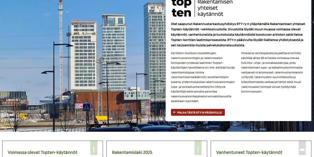 MARKKU HIENONEN Topten jalkautui Pohjois-Suomeen ja Kaakonkulmalle Taustaa Topten-kortistostaMaankäyttö- ja rakennuslaki MRL sekä sitä tarkentava maankäyttö- ja rakennusasetus MRA ovat voimassa vielä vuoden loppuun. Molemmat ovat kuitenkin siinä määrin yleispiirteisiä ”raameja”, että tarkemmat ohjeet ovat osoittautuneet tarpeellisiksi. Ympäristöministeriön ja eri järjestöjen julkaisemat täydentävät ohjeet ovat olleet ei-velvoittavia, mutta hyvin tärkeitä malleja ja esimerkkejä kelvollisista toimintatavoista.Uusi pian voimaan astuva rakentamislaki ja sitä tarkentavat asetukset tarvinnevat vastaavaa täydentävää ohjeistusta, kun niitä aletaan soveltaa käytäntöön.Suomen suurimpien kuntien rakennusvalvonnat ovat tehneet määrätietoista yleisimpien haasteiden ratkaisemiseen keskittynyttä kehitystyötä pääosin omakustanteisesti. Työtä on tehty yhdessä rakennusalan muiden toimijoiden kanssa, ja tuloksena on ollut merkittävän laajuinen Topten-kortisto,…