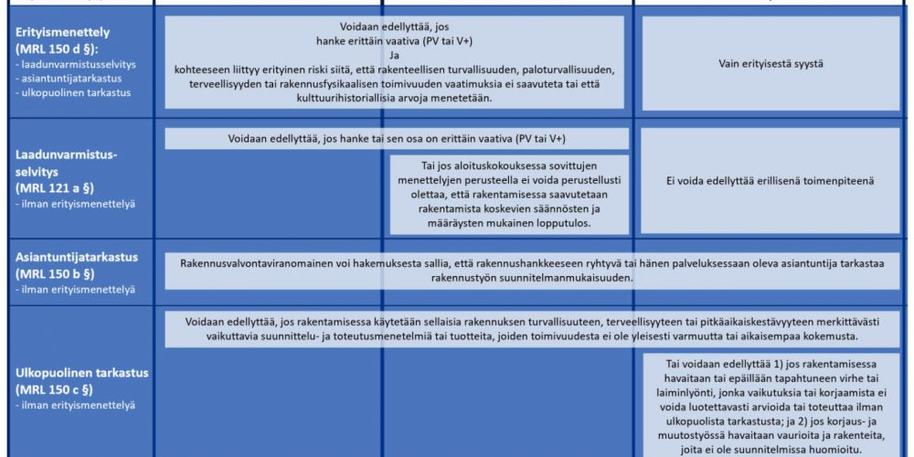 HENNA AHLQVIST Erityismenettely Laadunvarmistusselvitys, asiantuntijatarkastus ja ulkopuolinen tarkastus erityismenettelyn toimenpiteenä tai erikseen. Kuva 1. Rakenteilla oleva Airport Center Hotel Vantaalla. Hankkeessa on edellytetty erityismenettelyn toimenpiteenä MRL 150 c § mukaista ulkopuolista tarkastusta kantavien ja jäykistävien rakenteiden rakennesuunnitelmien osalta.Rakentamislain myötä erityismenettelyn, ulkopuolisen tarkastuksen ja laadunvarmistusselvityksen käyttäminen tulee lisääntymään. Tietyissä tapauksissa erityismenettelyn toimenpiteitä on jatkossa edellytettävä aiemman harkinnanvaraisuuden sijaan. Mikä muuttuu ja miten se vaikuttaa rakennusvalvonnan työhön?Erityismenettely lainsäädännössäErityismenettely on ollut lainsäädännössä vuodesta 2006. Tällöin se oli ympäristöministeriön asetuksessa Rakentamisen valvonta ja tekninen tarkastus ja sitä edellytettiin hankkeissa, joissa mahdollisesta virheestä suunnittelussa, rakentamisessa tai käytössä saattoi seurata suuronnettomuuden vaara.Nykyinen erityismenettely on ollut maankäyttö-…