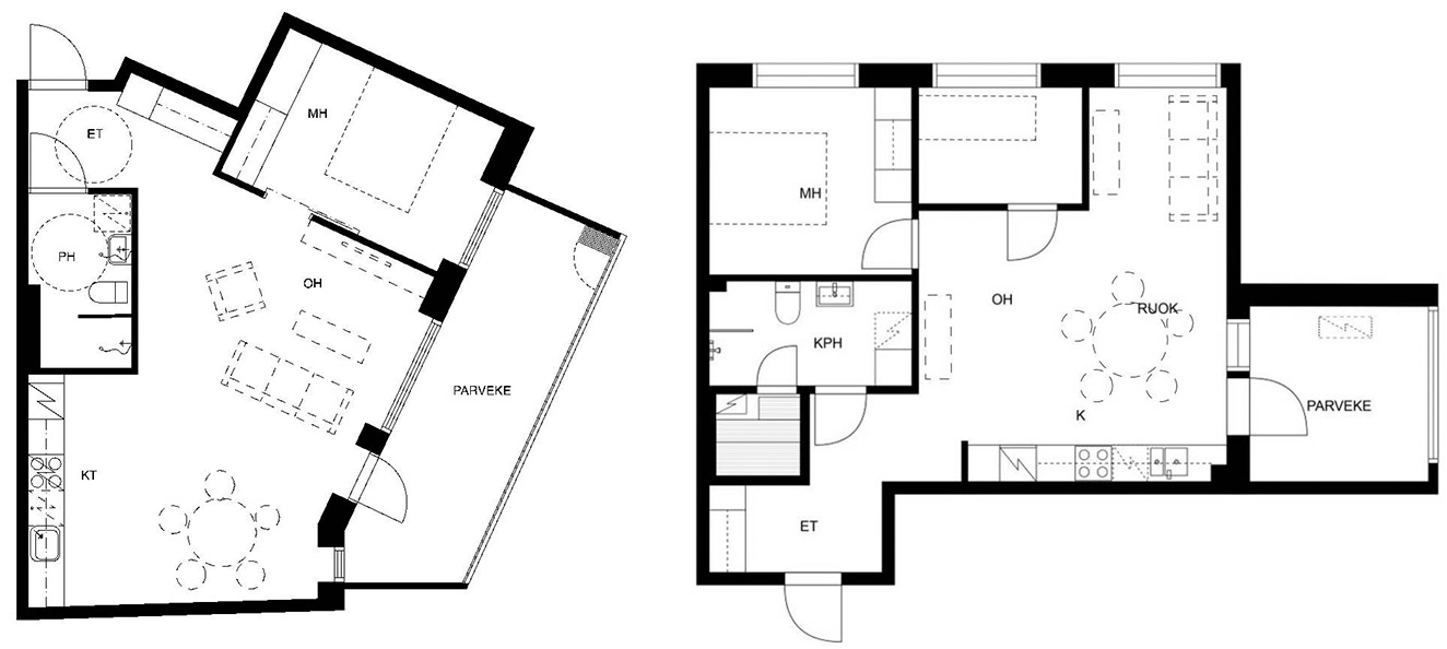 Vielä esimerkit uudehkoista lähes yllä olevan verrokin kokoisista asunnonnoista: Vuonna 2023 rakennettu kolmisakarainen tähtikerrostalo. Asunto 2 h + kt, 57 m² lasitetulla parvekkeella.