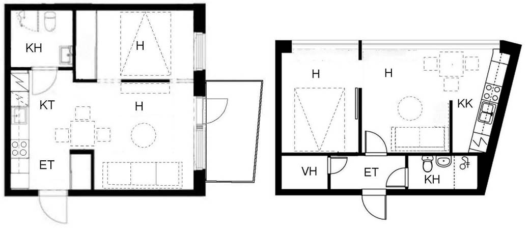 Uusissa asunnoissa saattaa olla kaukokylmä, älylukot, liukuovikomerot, oma sauna ja iso lasitettu parveke. Yllä olevan esimerkin yksiön talossa on 74 asuntoa, mutta vain yksi hissi (tosin tilava tavaroiden muuttoa varten). Lisäksi puuttuu maininta parvekenäkymästä ja annetaan virheellinen kuva asunnon monipuolisesta kalustettavuudesta ja toiminnallisuudesta. Parveke toimiikin usein varastona, ja taloyhtiössä kysellään parvekeverhojen yhteishankinnasta.