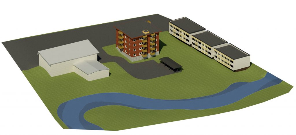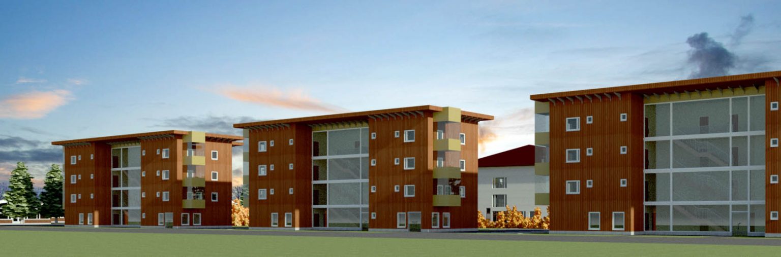 Kuva 3: Kauhajoen Topeekan puukerrostalo keskellä. Pääkadun varteen on varattu liiketilaa. Parvekkeilla on jokinäkymä.