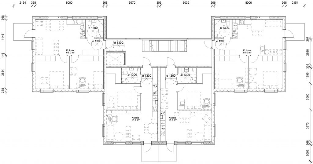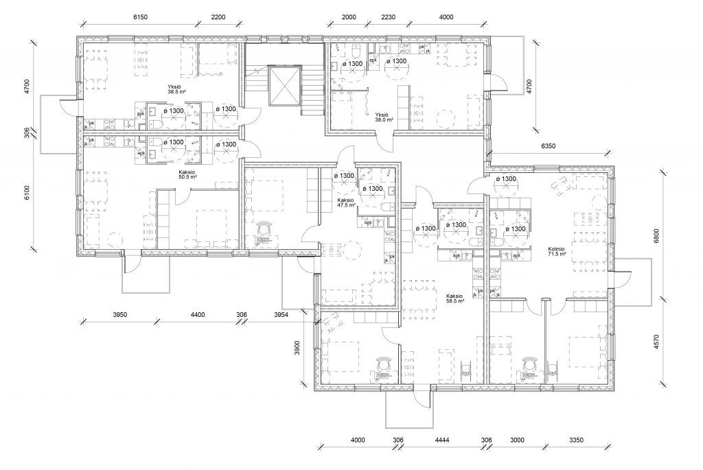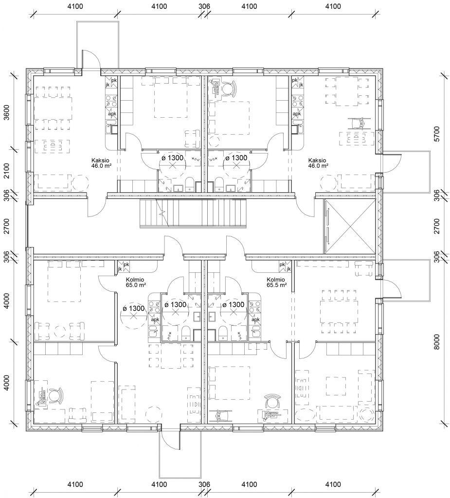 Kuva 6: Kuortaneen kerrostalossa tasomoduulien käyttö mahdollistaa tilamoduuleita vapaamman tilajaon. Asunnot on suunniteltu sekä vanhoille että nuorille asukkaille.