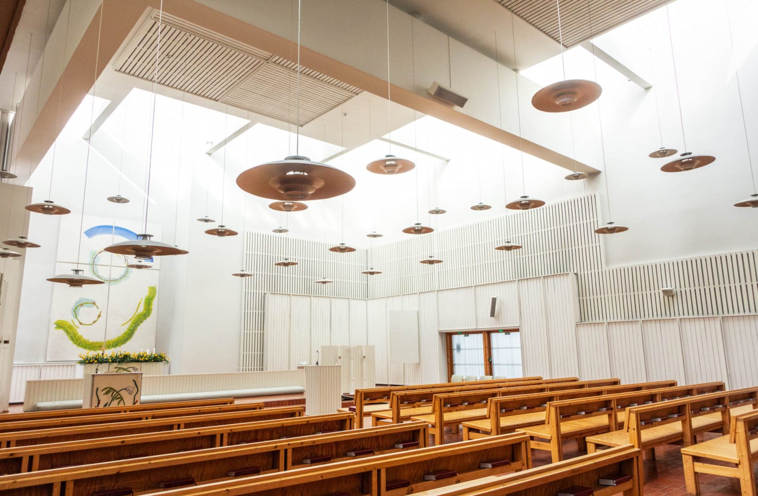 Kirkon aineelliseen kulttuuriperintöön kuuluvat kirkkorakennusten lisäksi muun muassa kirkollinen esineistö ja kirkkotaide. Kuvassa Juha Leiviskän suunnittelema Pyhän Tuomaan kirkko.