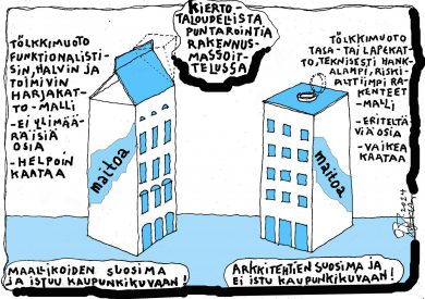 Kiertotalous on jo nyt mahdollista. Jos jokaista hanketta maltettaisiin ajatella kokonaisuutena, jätevirrat pystyttäisiin pysäyttämään. Vaikuttaa kuitenkin siltä, että monesti ei ole aikaa tai intoa ajatella loppuun asti. Liian paljon puretaan ilman pienintäkään aikomusta käyttää materiaalia hyödyksi. Sellainen on huonoa suunnittelua.
