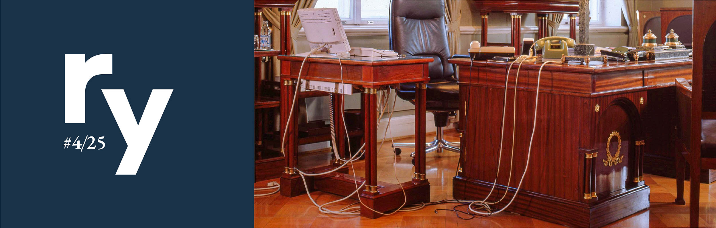 Pääministerin virkahuone 30 vuotta sitten ennen restaurointia. Usein koetaan hyvänä, kun tekniikka ei ole näkyvissä.